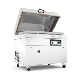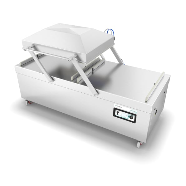 Ein Industriemodell komplett aus Edelstahl und mit Doppelkammern für minimalen Stillstand des Verpackungsprozesses. In unterschiedlichen Kammergrößen erhältlich. Wird standardmäßig mit 10 Programmen, flachen Arbeitsplatten und Soft Air geliefert.
