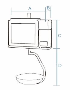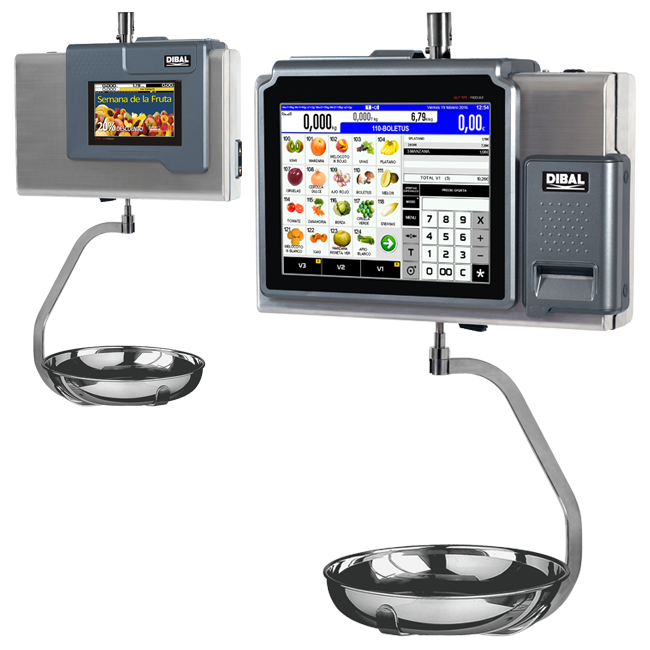 Elektronische Waage im hängenden Edelstahl-Format mit Bondrucker, 12″-Touchscreen auf Verkäuferseite und 7″-TFT auf Kundenseite.